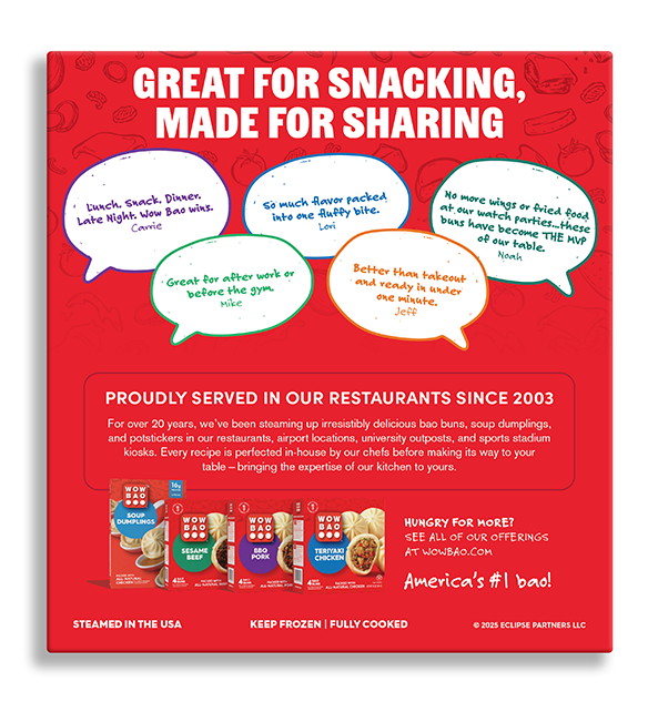 Bao is the perfect portable snack or meal! Once prepared, simply peel off the paper and savor every bite. With so much flavor packed inside Wow Bao’s signature bao, it is the perfect on-the-go solution to feed any need.
