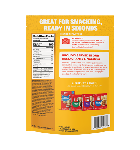 Bao is the perfect portable snack or meal! Once prepared, simply peel off the paper and savor every bite. With so much flavor packed inside Wow Bao’s signature bao, it is the perfect on-the-go solution to feed any need.
